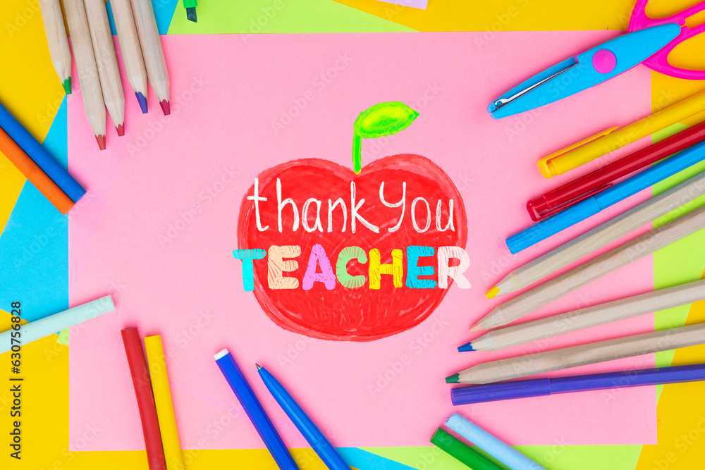Childish lettering for Teachers' Day. Appreciation of teachers top view flat lay concept. Colored paper, multi-coloured letters, supplies
