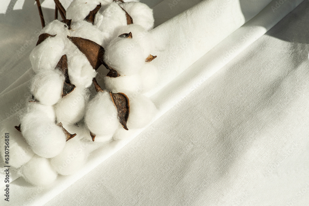 Cotton-plant harvest and cotton fabric linen. Fluffy fibers in flower balls on branch, white canvas. Weaving material for textile production