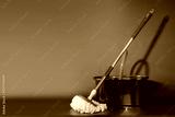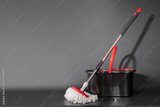 Cleaning concept mop and bucket. Cleaning products and spin mop with red details on the floor in the grey-black background