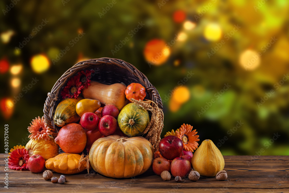 Thanksgiving day still life, background with empty copy space. Pumpkin harvest in wicker basket. Squash, vegetable autumn fruit, apples, and nuts on a wooden table. Halloween decoration fall design