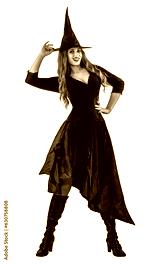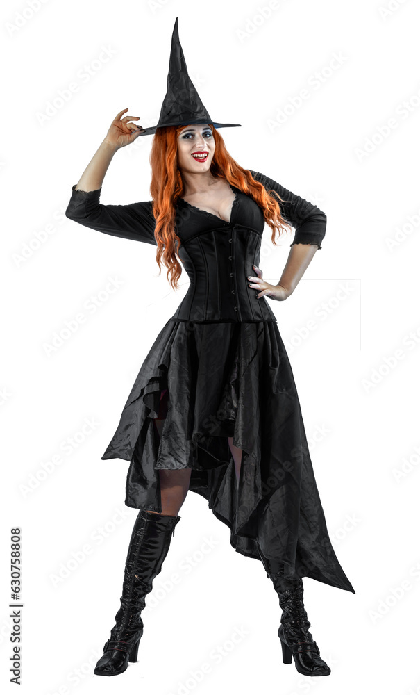 Witch on Halloween. Female wizard fairy character for All Saints' Day. Fantasy gothic red-haired Vampire girl in black dress. Enchantress dressed in carnival costume