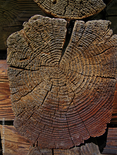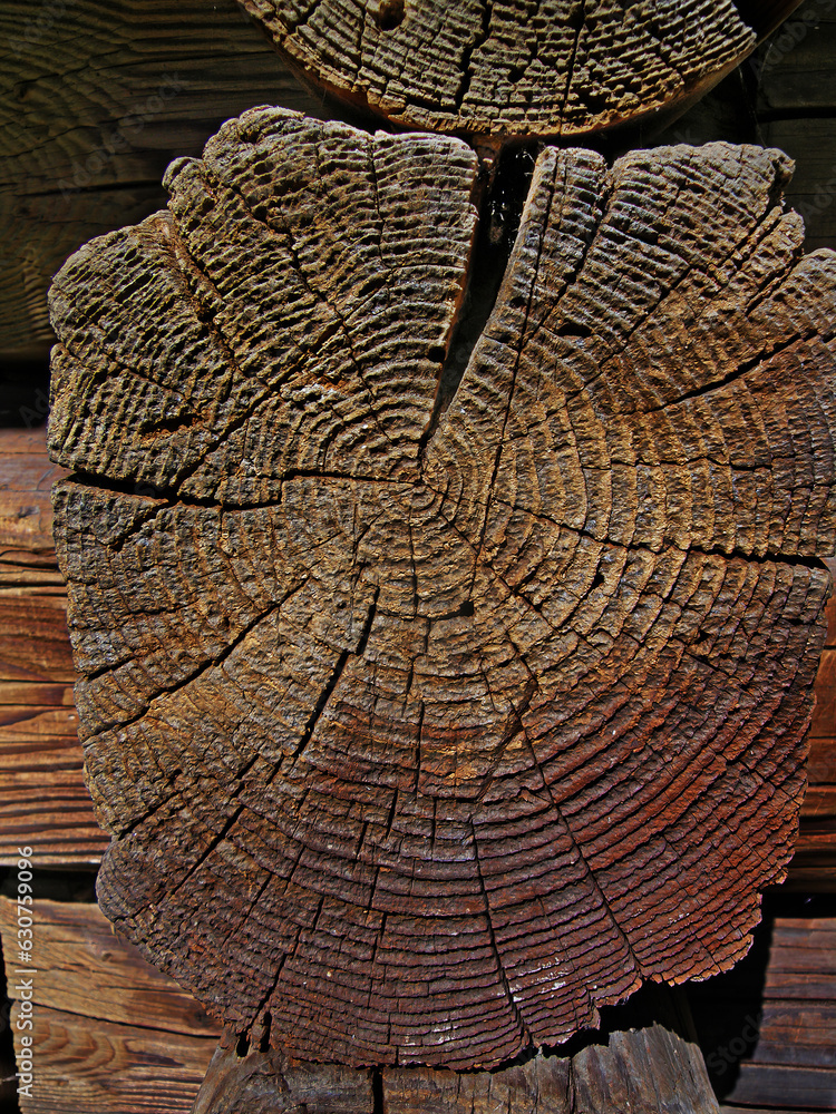 Fragment of wooden log wall. Rustic old wood cross section of a tree
