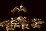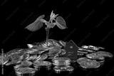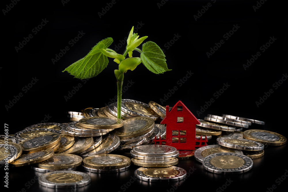 A young sprout with green leaves, 100 and 200 Kazakhstani tenge coins and a miniature symbolic red house