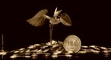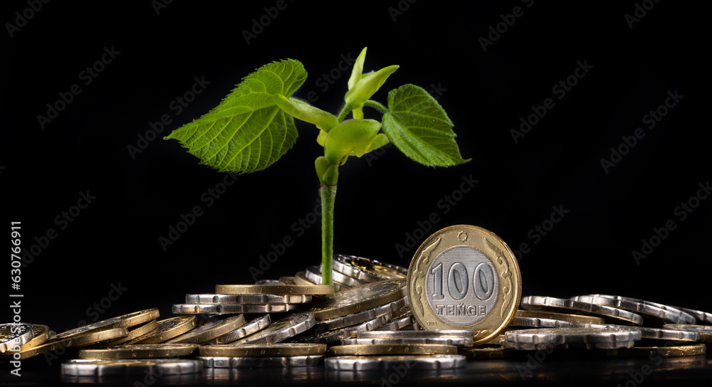 A young sprout with green leaves and a pile of coins in denominations of 100 and 200 Kazakhstani tenge on a black background