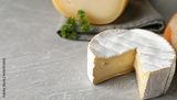 Tasty brie cheese on light table, closeup. Banner design with space for text