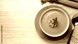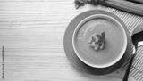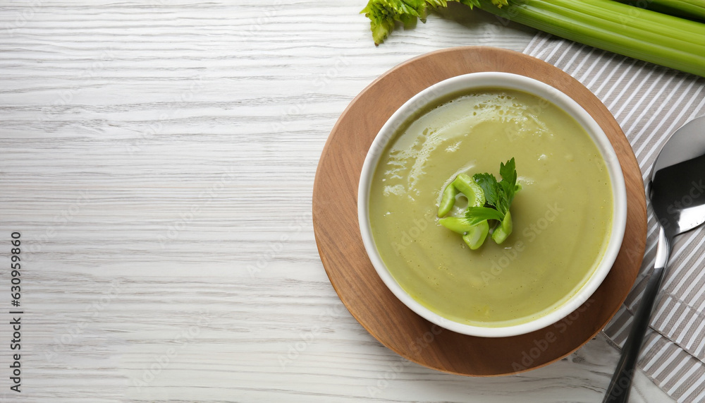 Bowl of delicious celery soup served on white wooden table, flat lay. Space for text