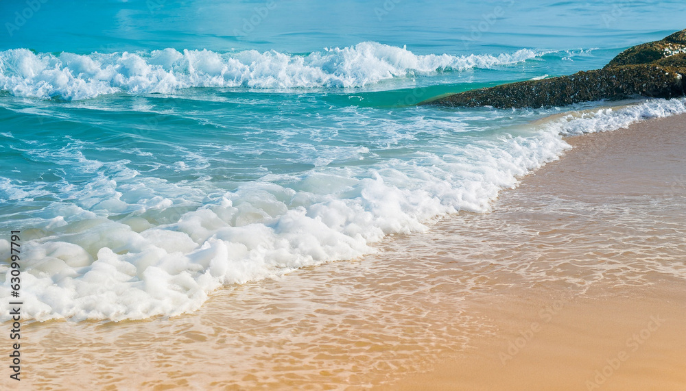 Beautiful tropical wave of summer sea surf. Soft turquoise blue ocean wave on the golden sandy beach