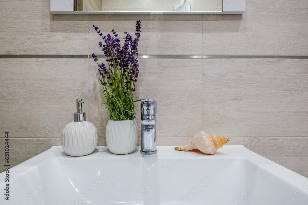 metal water tap with sink and faucet with bouquet of lavender flowers and shell in expensive bathroom