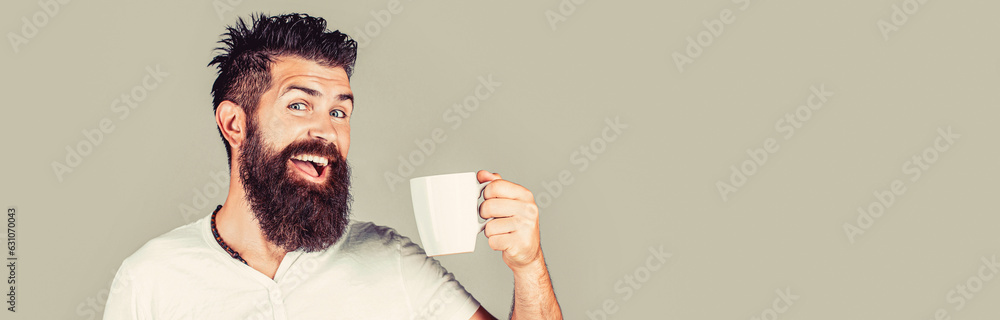 Good morning, man tea. Smiling hipster man with cup of fresh coffee, Happy man. Morning concept