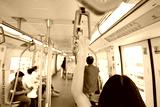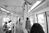 Woman hand firm grip safety handrail in elevated monorail train. Mass transit system in modern city. Inside of electric train. Tourist travel by city sky train. Public transportation. Urban transport.