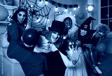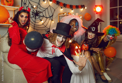 Group of friends disguised as crazy evil monsters having fun at Halloween party. Adult people with scary makeup sitting together on sofa in living room, looking at camera, smiling or making ugly faces