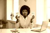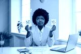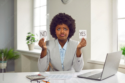African American business woman sitting at working desk with laptop in office, holding paper cards with words YES and NO, trying to make choice, and thinking with funny confused facial expression