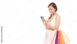 Surprised Asian young woman using smart phone for shopping holding shopping bags isolated on white background and copy space Excited beautiful girl get surprise from shopping store for discount