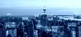 online communication concept, social network with speech bubbles with customer review on blue cityscape background.