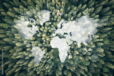 Sustainable habitat world concept. Distant aerial view of a dense rainforest vegetation with lakes in a shape of world continents, clouds. 3d rendering.