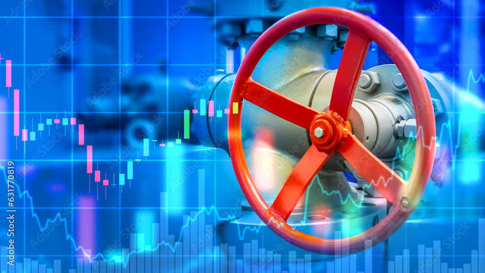 Oil and gas industry. Pipe with red valve. Fluctuating graph on blue. Oil and gas pipe close up. Oil quote chart. Background for gas exchange. Changes in prices in energy market. 3d image