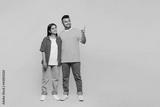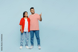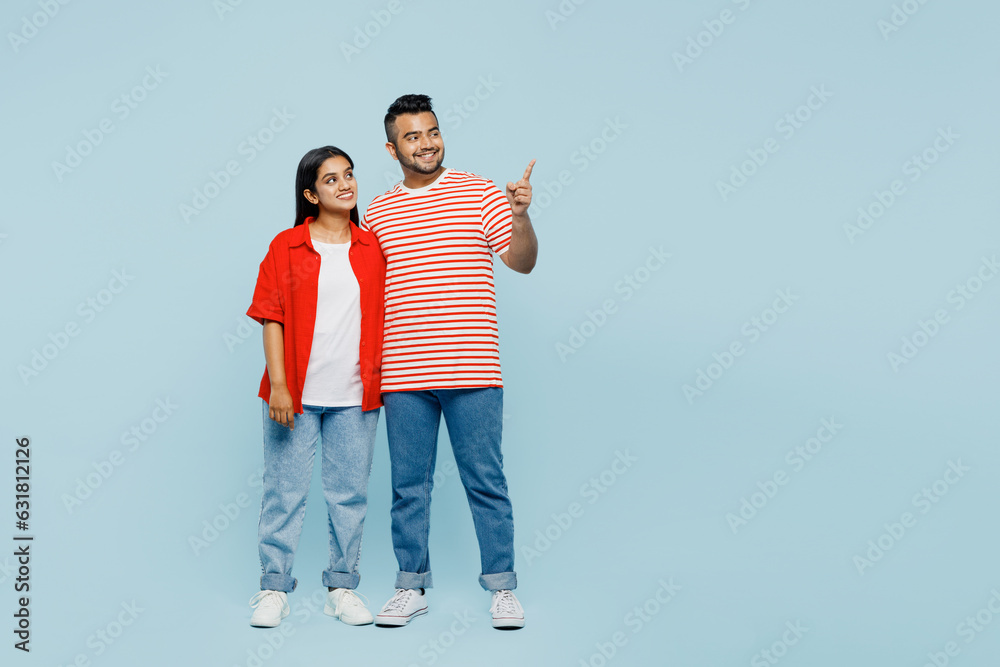Full body young couple two friend family Indian man woman wear red casual clothes t-shirts together point index finger aside on area show something isolated on pastel plain blue cyan color background