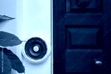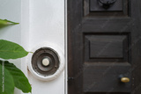 Antique style door bell seen on the entrance to a large private home. Part of the grand, double wooden doors can be seen in the background.