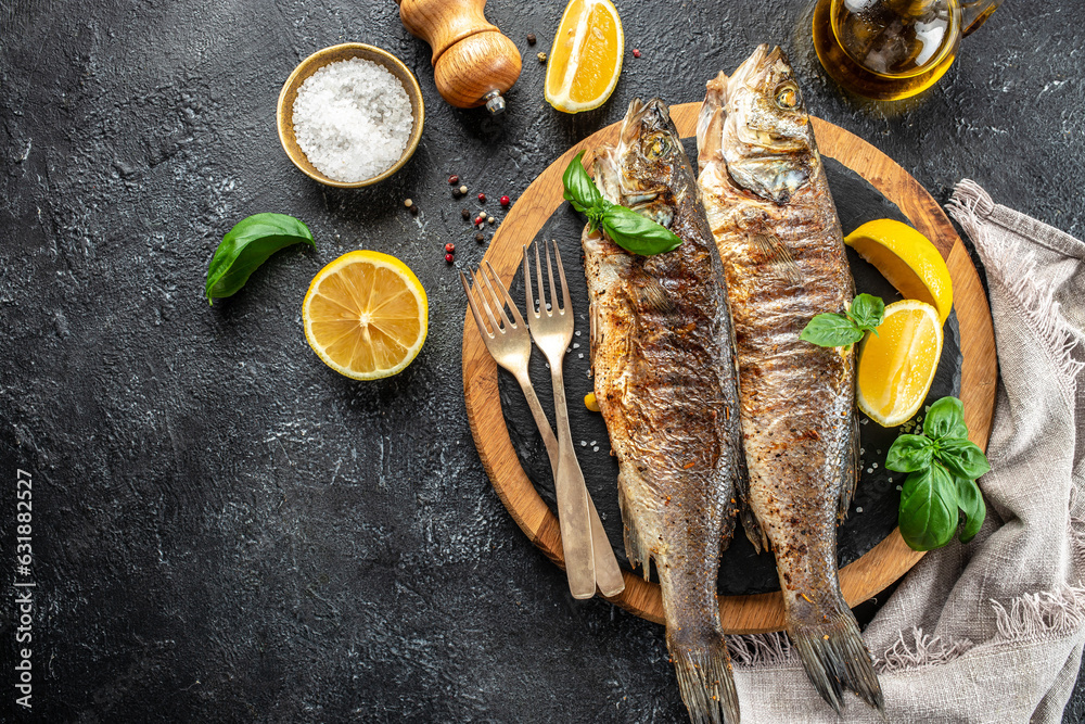 Seabass or sea bass fish roasted on a dark background. banner, menu, recipe place for text, top view