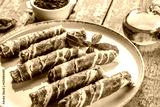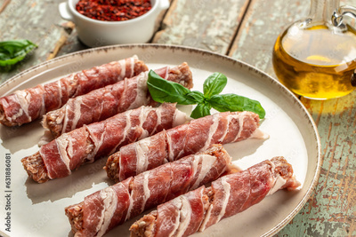 pork mince with bacon wrapped sausages. Food recipe background. Close up