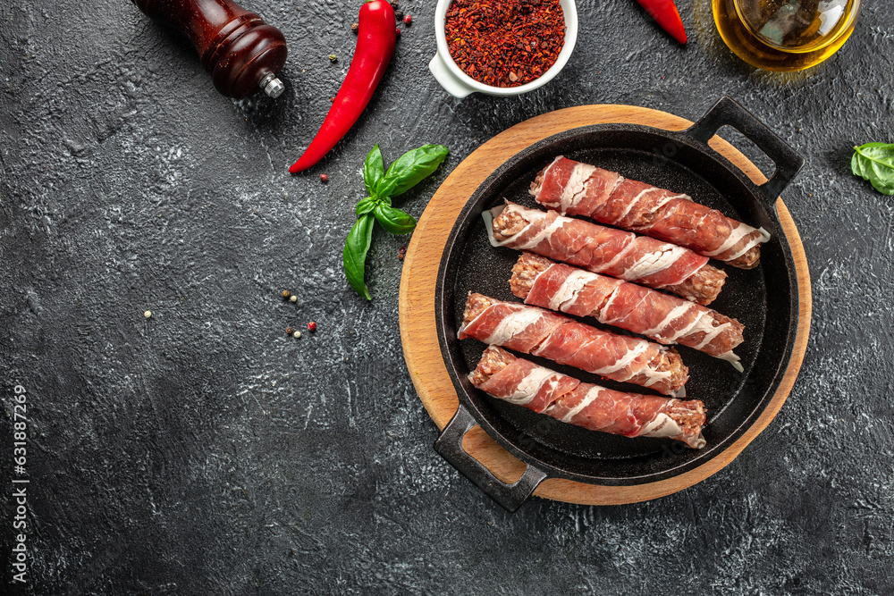 Pork wrapped in bacon in pan on a dark background. banner, menu, recipe place for text, top view