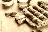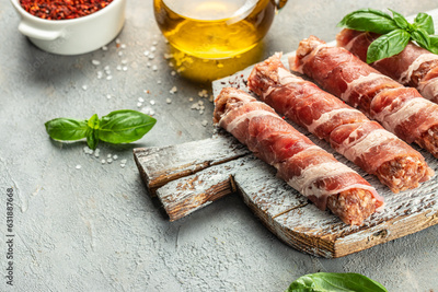 pork mince wrapped with delicious pieces of bacon on a wooden board. Food recipe background. Close up