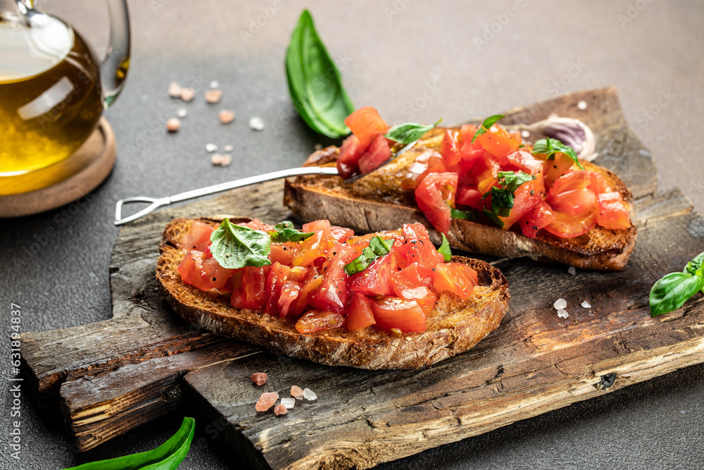 bruschetta with tomato and basil on a wooden board. Food recipe background. Close up