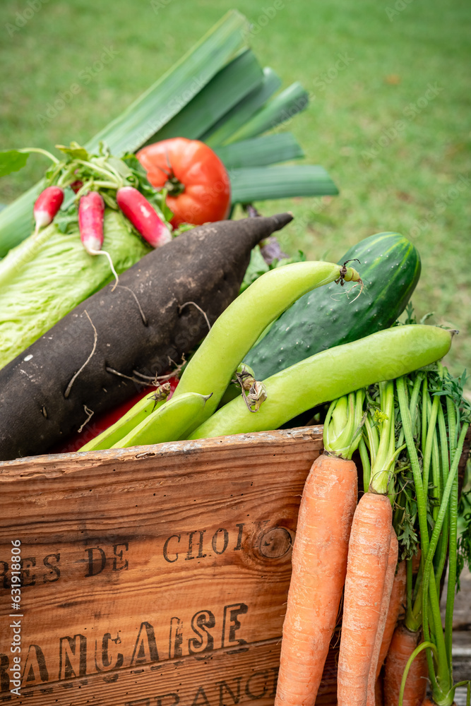 fresh and colorful vegetable in a vintage wooden box "française" meaning french