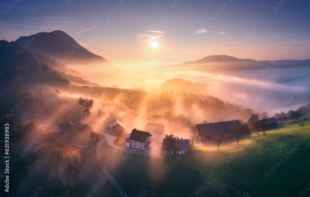 Aerial view of mountain village in orange low clouds at sunrise in autumn in Slovenia. Top view of beautiful houses on hill in fog, green meadows, trees, sky at golden dawn in fall. Colorful landscape