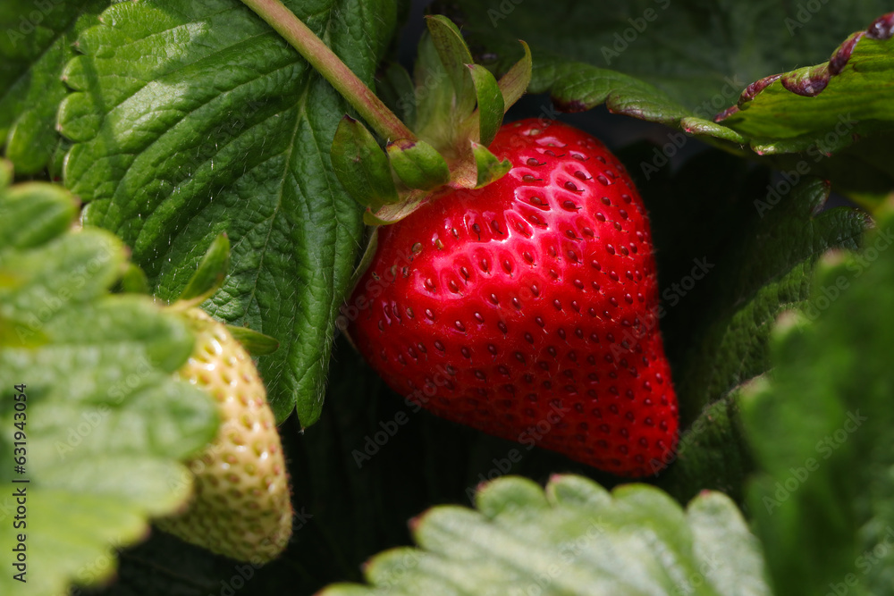 Ripe Strawberry Amongst Green Leaves (Fragaria x ananassa)