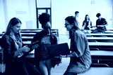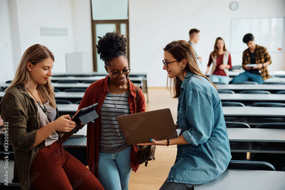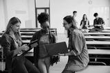 Happy female students using wireless technology in lecture hall.