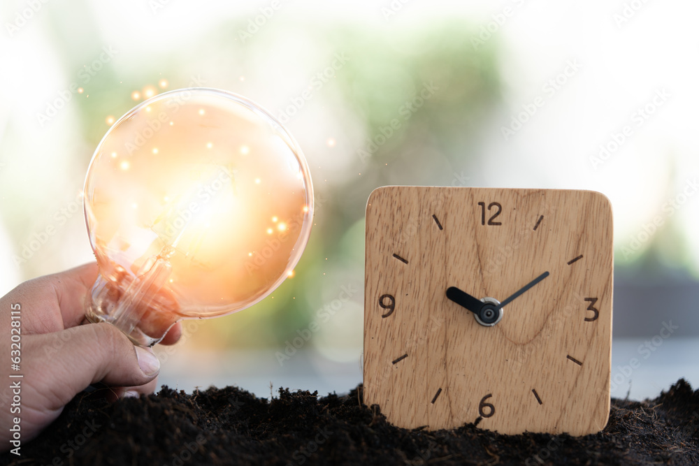Hand holding light bulb with a wood clock on the soil. Idea or energy and environment concept