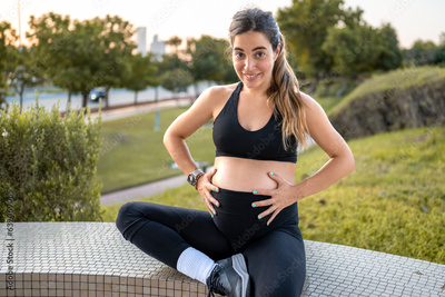 Beautiful young pregnant woman sitting in the park at sunset.