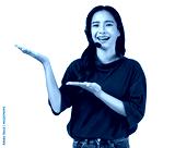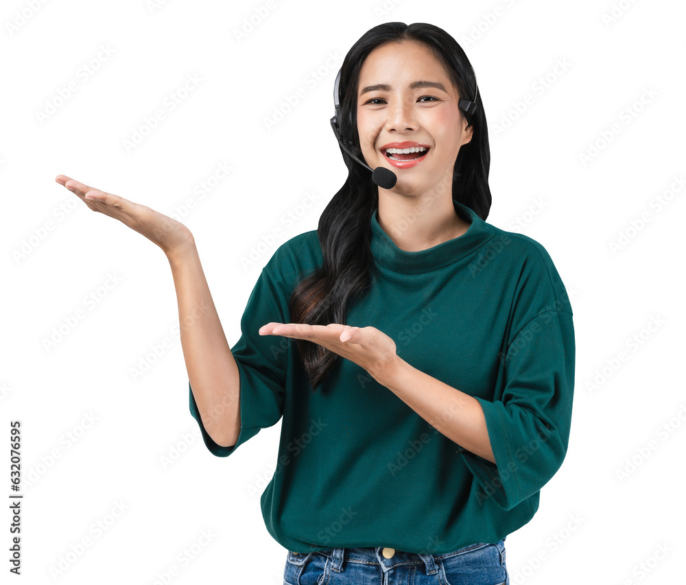 Cheerful beautiful Asian woman consultant wearing microphone headset of customer support phone operator at workplace on white background.