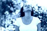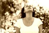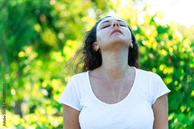 Young woman sweating on a hot summer day taking a deep breath while looking at the sky
