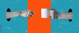 Art collage, hand with coffee cup on blue background with space for advertisement.