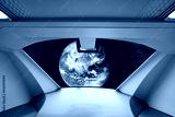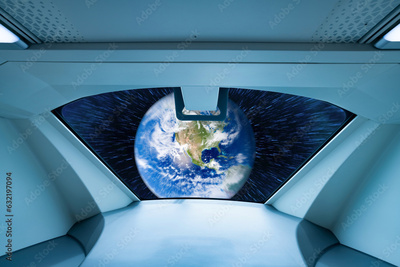 Window view of alien spaceship. UFO or unidentified flying objects. Alien invasion. Space travel. Alien spaceship and extraterrestrial technology. Futuristic spacecraft. Earth image provided by Nasa.