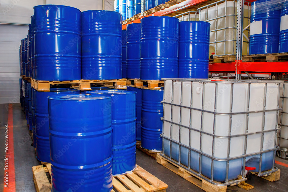 Chemical warehouse. Barrels on pallets. Warehouse interior with shelving. Storage of chemical products. Metal and paste barrels. Tanks with chemical liquids. Modern warehouse without anyone