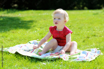 Happy toddler girl eating berries sitting in the garden