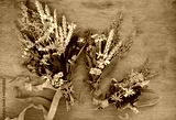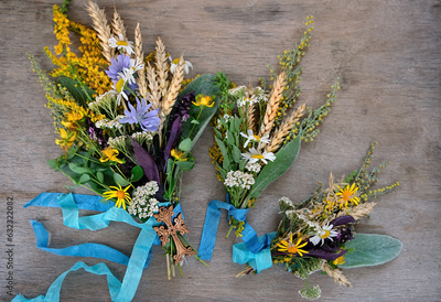 Herbs tied to sacred bouquets on wooden table. Herbal consecration - traditional customs of the Roman Catholic Church. August 15 - day of the Assumption of Mary, know as Divine Mother of Herbs