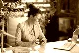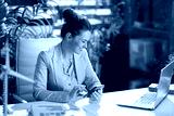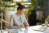 smiling bookkeeper woman in green office using smartphone