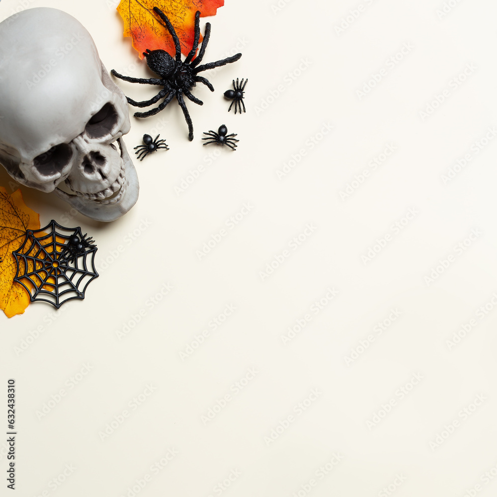 Halloween greeting card with pumpkin, skulls, bony hands and leaves