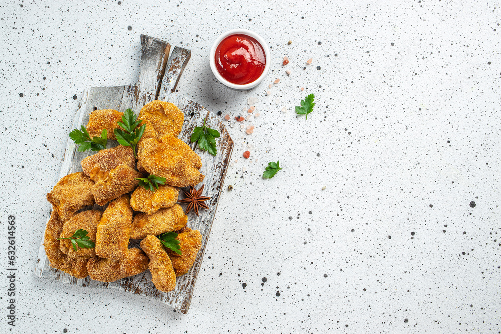 crispy homemade baked chicken nuggets on a light background, banner, menu, recipe place for text, top view