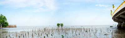 Green mangrove tree planting in mangrove forest. Mangrove ecosystem. Natural carbon sinks. Mangroves capture CO2 from the atmosphere. Blue carbon ecosystems. Mangroves absorb carbon dioxide emissions.