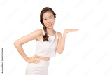 Happy beautiful young asian woman holding copy space imaginary on beauty palm for insert advertisement isolted on white background Smiling female invite to shoppiing Attractive beautiful girl portrait