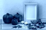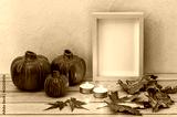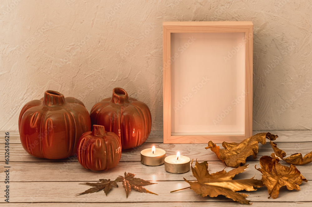 White photo frame, ceramic figurines of pumpkins, lit candles and golden autumn leaves on a wooden table. Thanksgiving, Halloween concept.