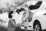 Smiling mother bringing daughter back to school saying goodbye on car parking