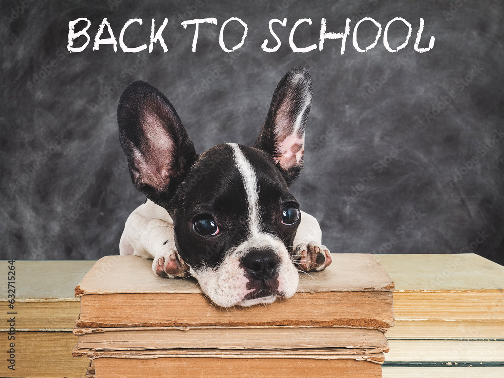 Back to school. Cute puppy and blackboard with inscription. Close-up, isolated background. Studio shot, day light. Concept of care, education, obedience training and raising of pet