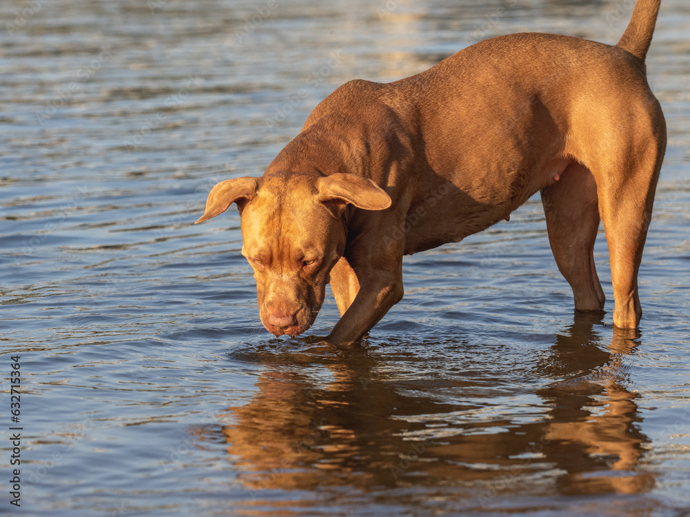 Cute dog swimming in the river on a clear, sunny day. Closeup, outdoors. Day light. Concept of care, education, obedience training and raising pets