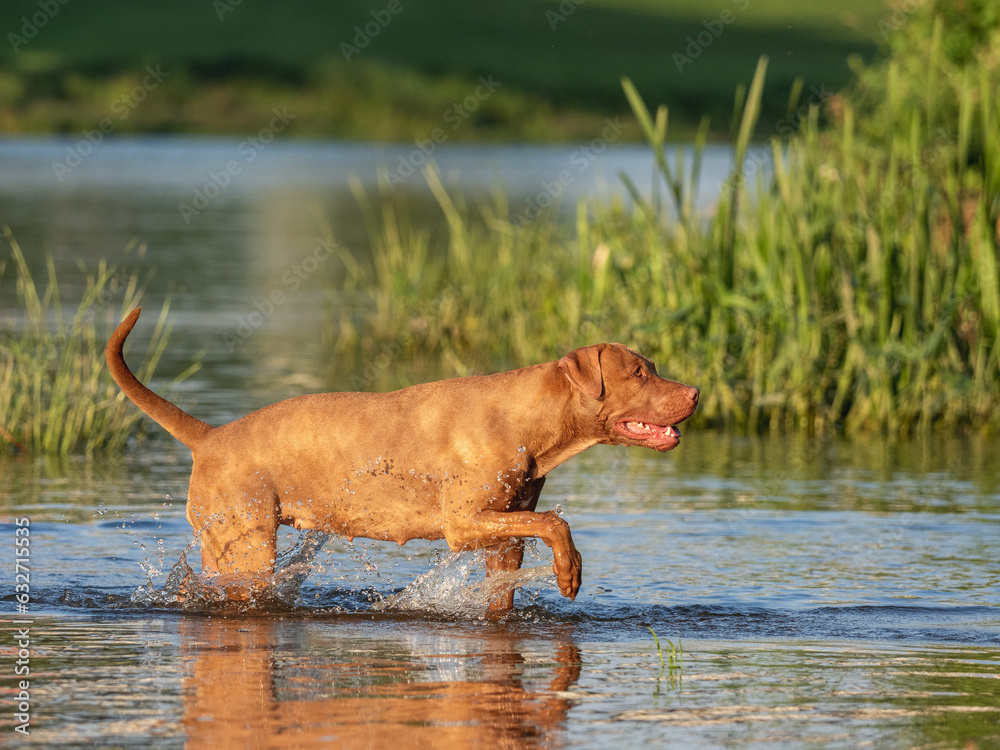 Cute dog swimming in the river on a clear, sunny day. Closeup, outdoors. Day light. Concept of care, education, obedience training and raising pets